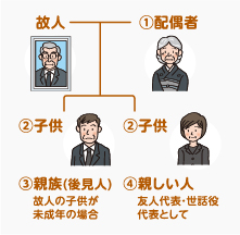 また、故人に近親者がいない場合や、故人が生前に指名した人がいる場合は「友人代表」「世話役代表」として親しい人や指名された人が喪主を代行することもあります。